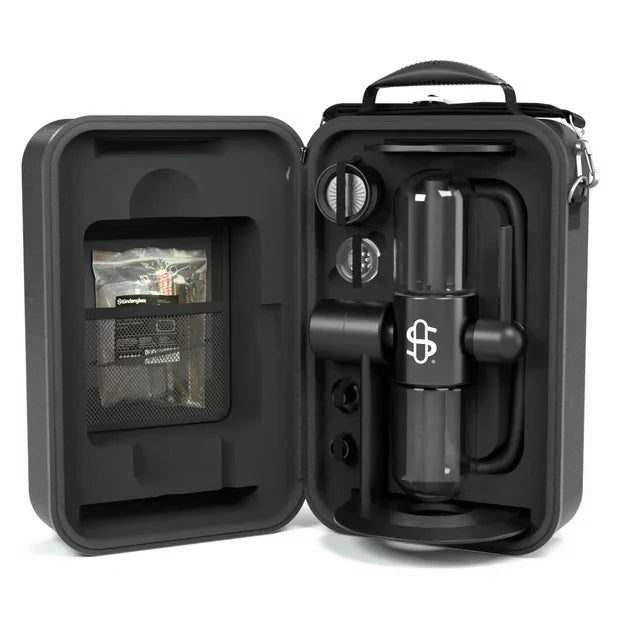 The Stundenglass Kompact Gravity Bong Infuser features the same 360° gravity system, dynamic design and immersive experience as the original Stundenglass Gravity Bong but in a more refined and portable size that includes a custom-fit travel case.